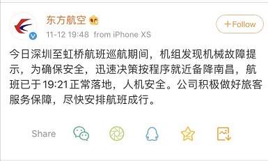 深圳飞往上海的东方航空MU5352航班,